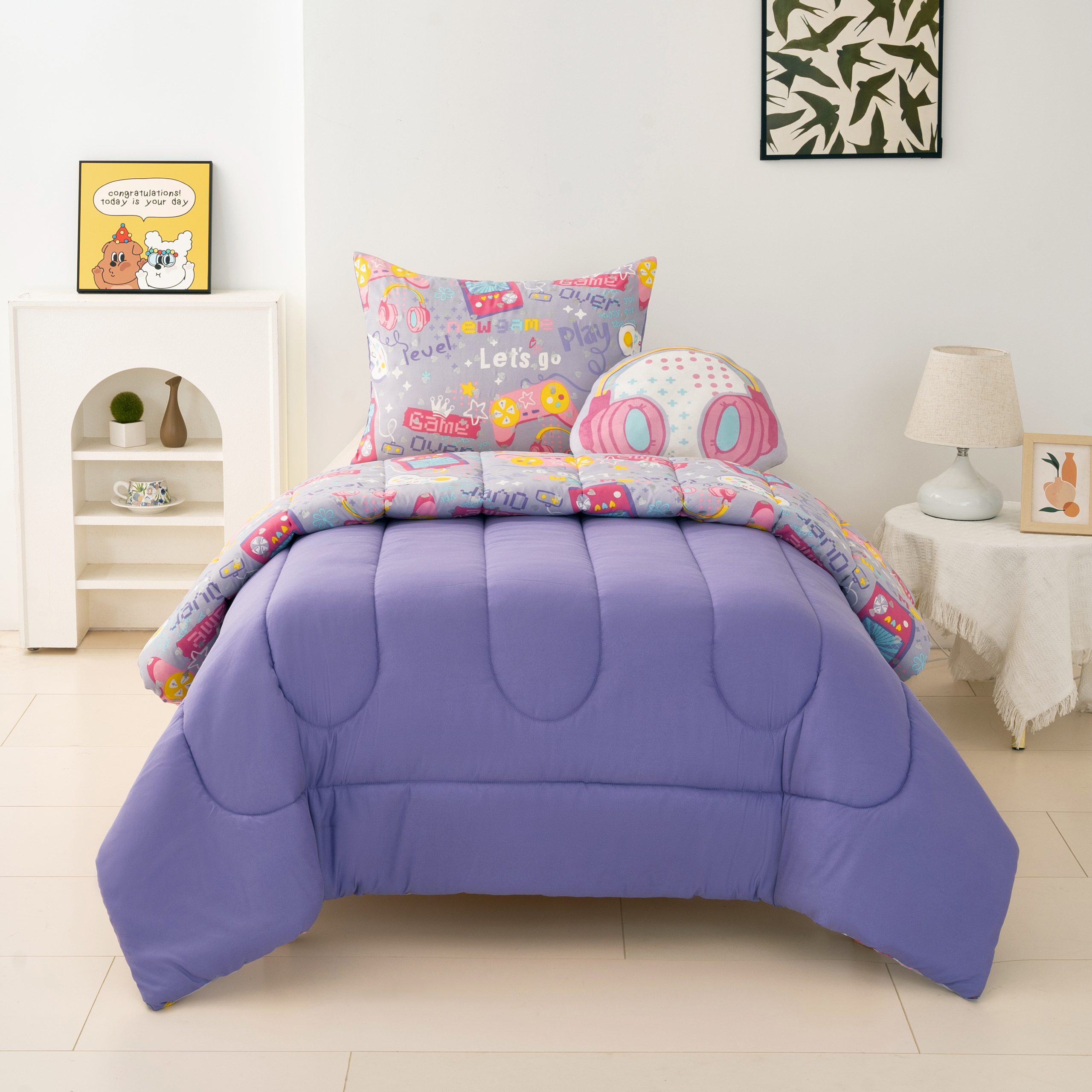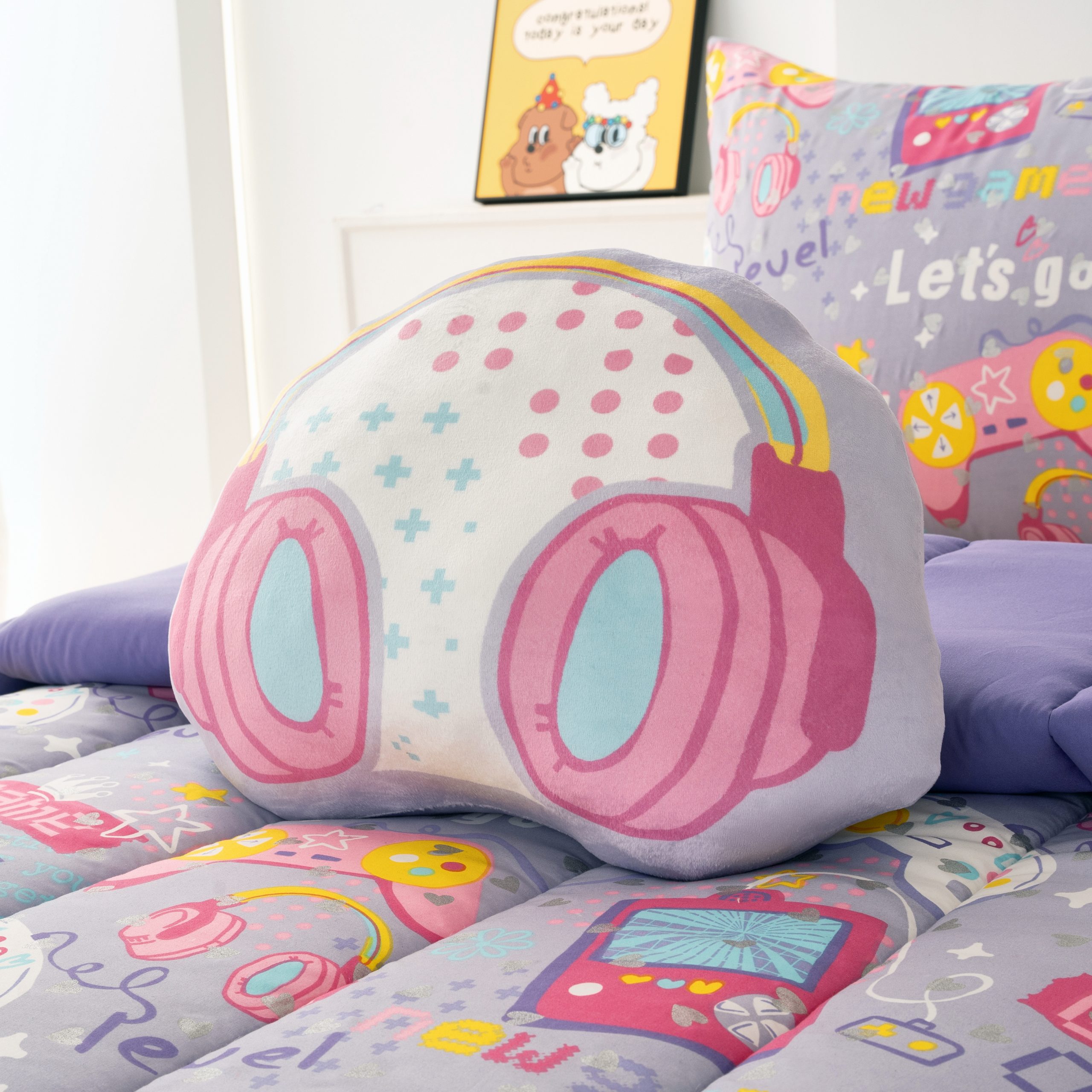 【Playful Accents】 The set includes a standout headset-shaped decorative pillow, serving as both a trendy focal point and a comfortable backrest for reading or gaming. Whether paired with clean white furniture or a colorful macaron-themed room, this set turns any sleeping area into a fashionable retreat.