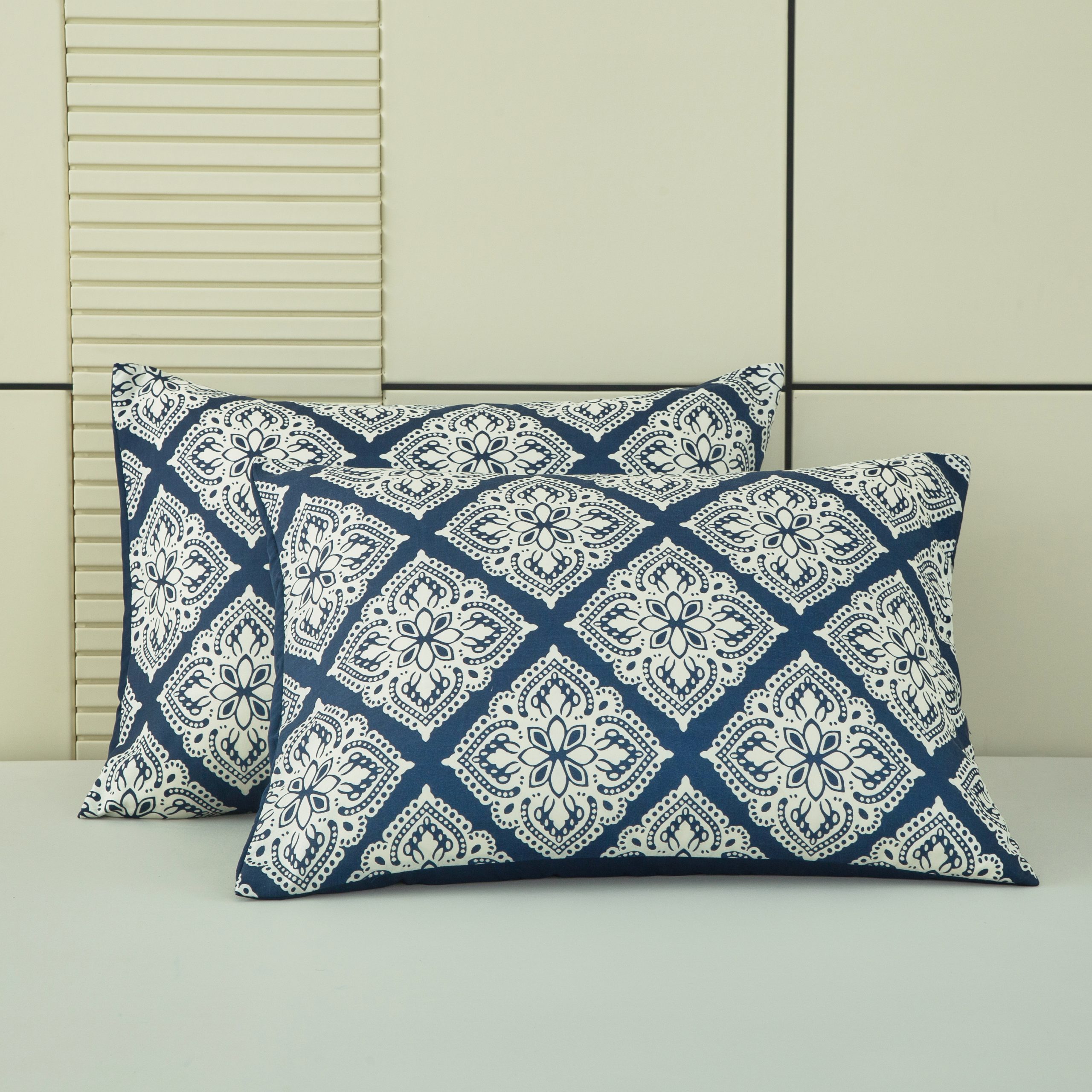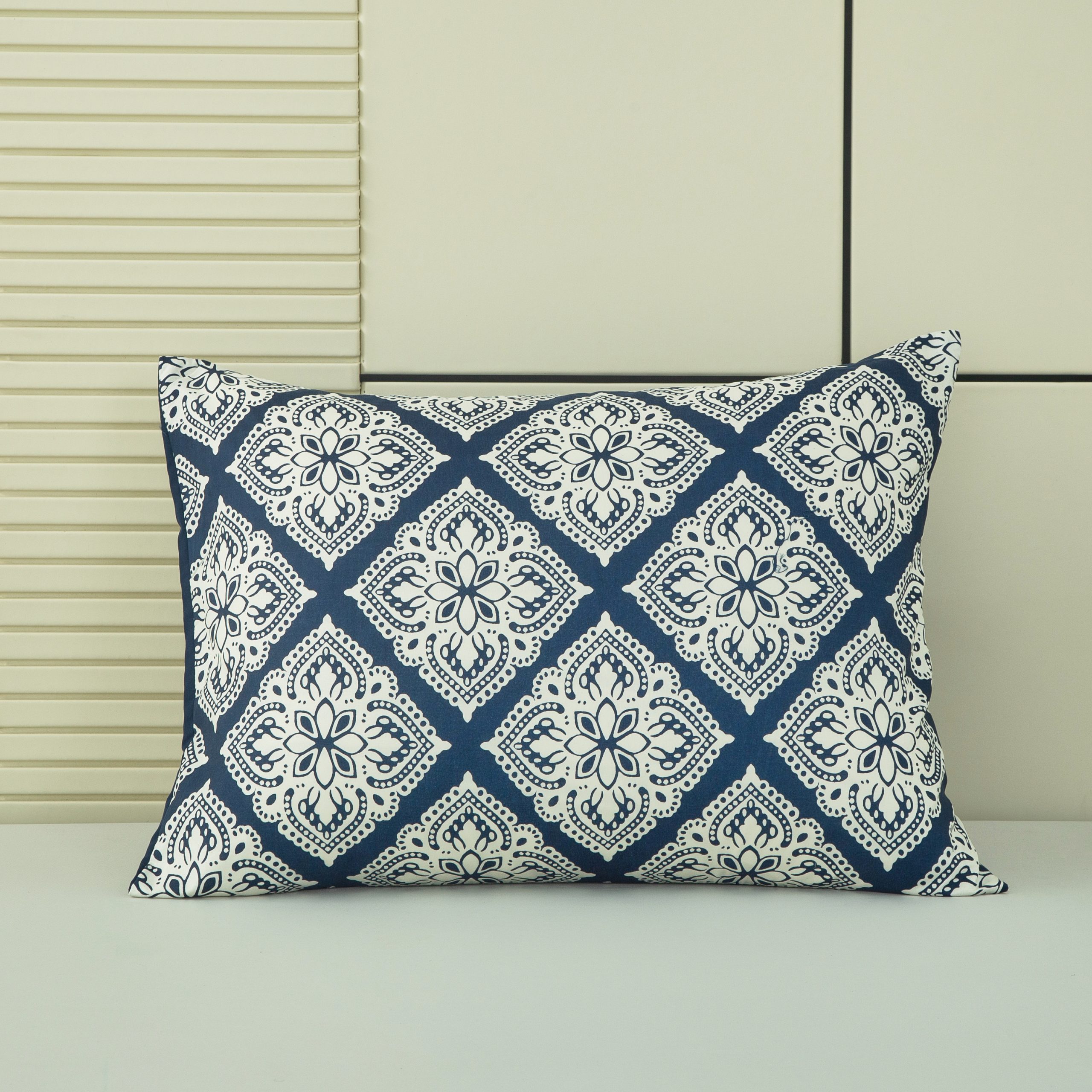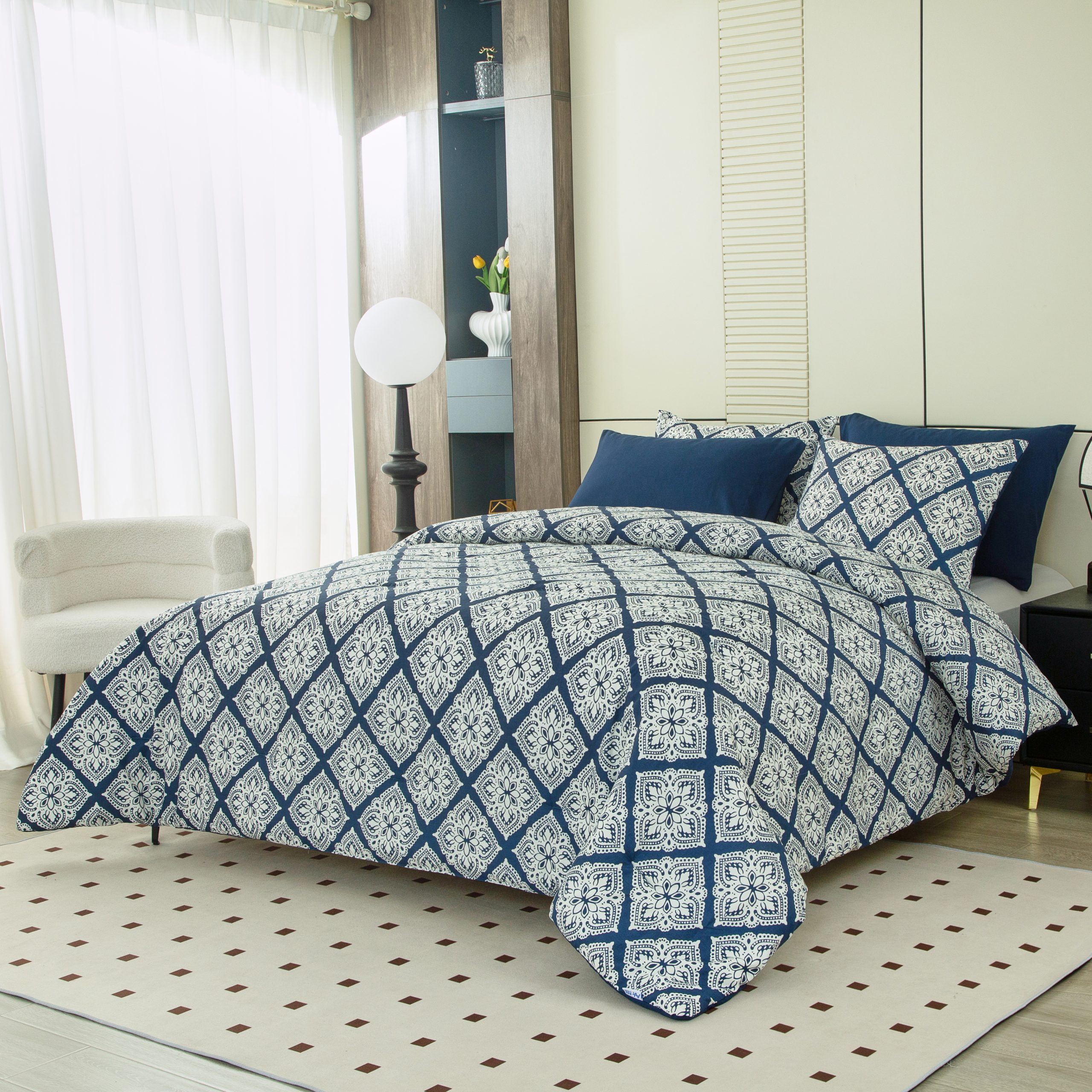 Exquisite rhombus geometric patterns outlined in classic navy blue, blending bohemian and mandala art elements. Featuring a skin-friendly texture and evenly distributed filling, this set brings a sophisticated, exotic aesthetic to your bedroom.